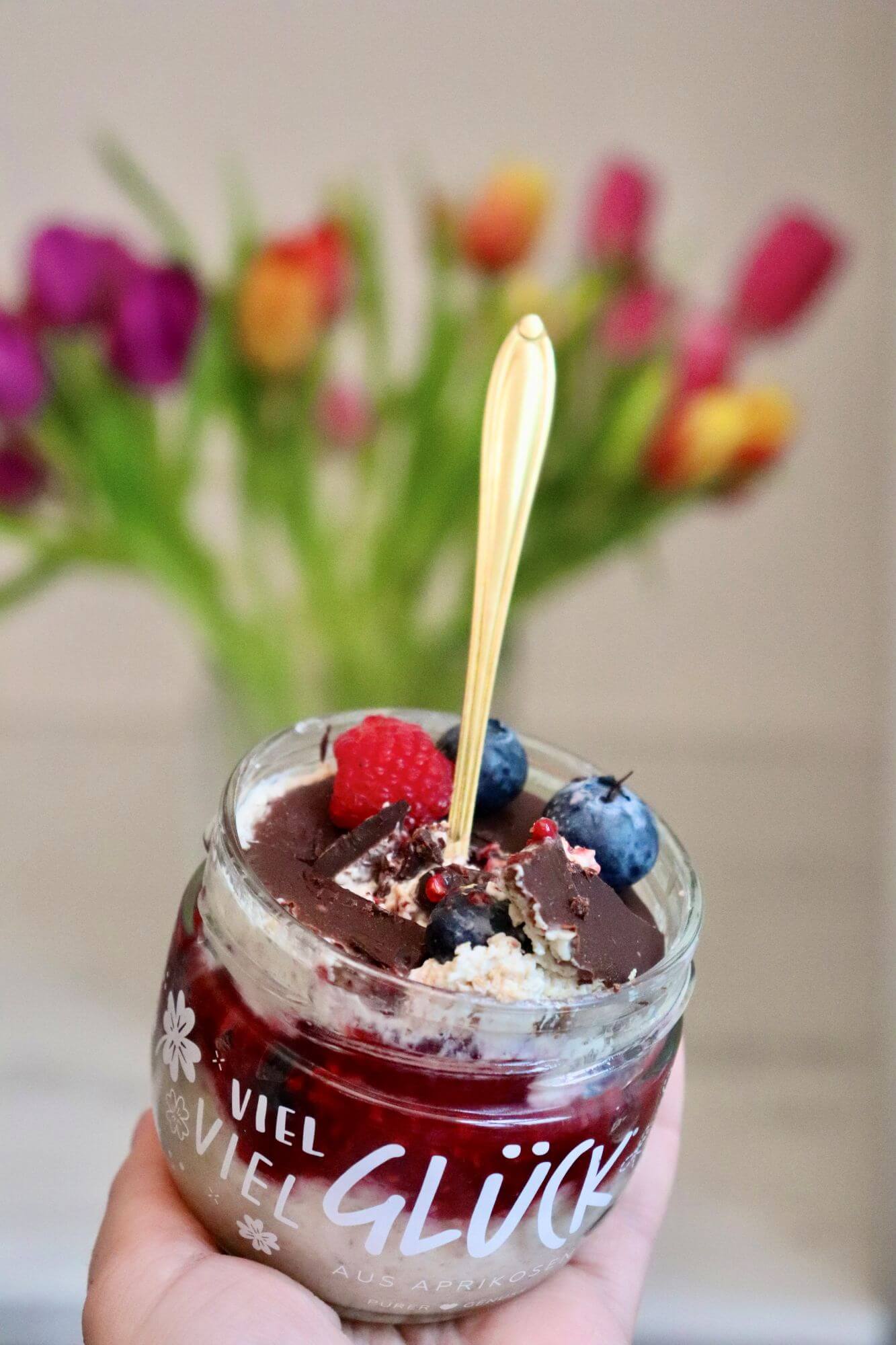 - Die Haferflocken-Joghurt Mischung als erste Schicht (ca. 2 cm) in drei leere GLÜCK Gläser füllen. Danach eine Schicht GLÜCK mit Leichtigkeit aus Himbeeren darauf verteilen. Diese Schicht nun mit ein paar frischen Beeren garnieren. Zuletzt eine weitere Schicht aus Haferflocken und Joghurt hinzugeben.