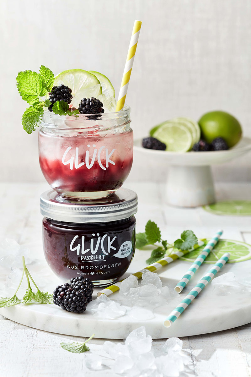 - Brombeermischung auf 4 GLÜCKgläser verteilen und die mit Crushed Ice füllen.