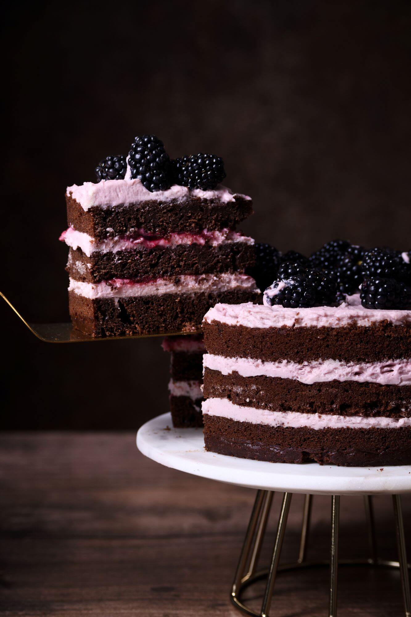 - Verziere die Oberseite der Torte großzügig mit frischen Brombeeren. Wenn du möchtest, kannst du die Torte auch mit Schokoladenraspeln oder kleinen Schokoladenstückchen bestreuen.