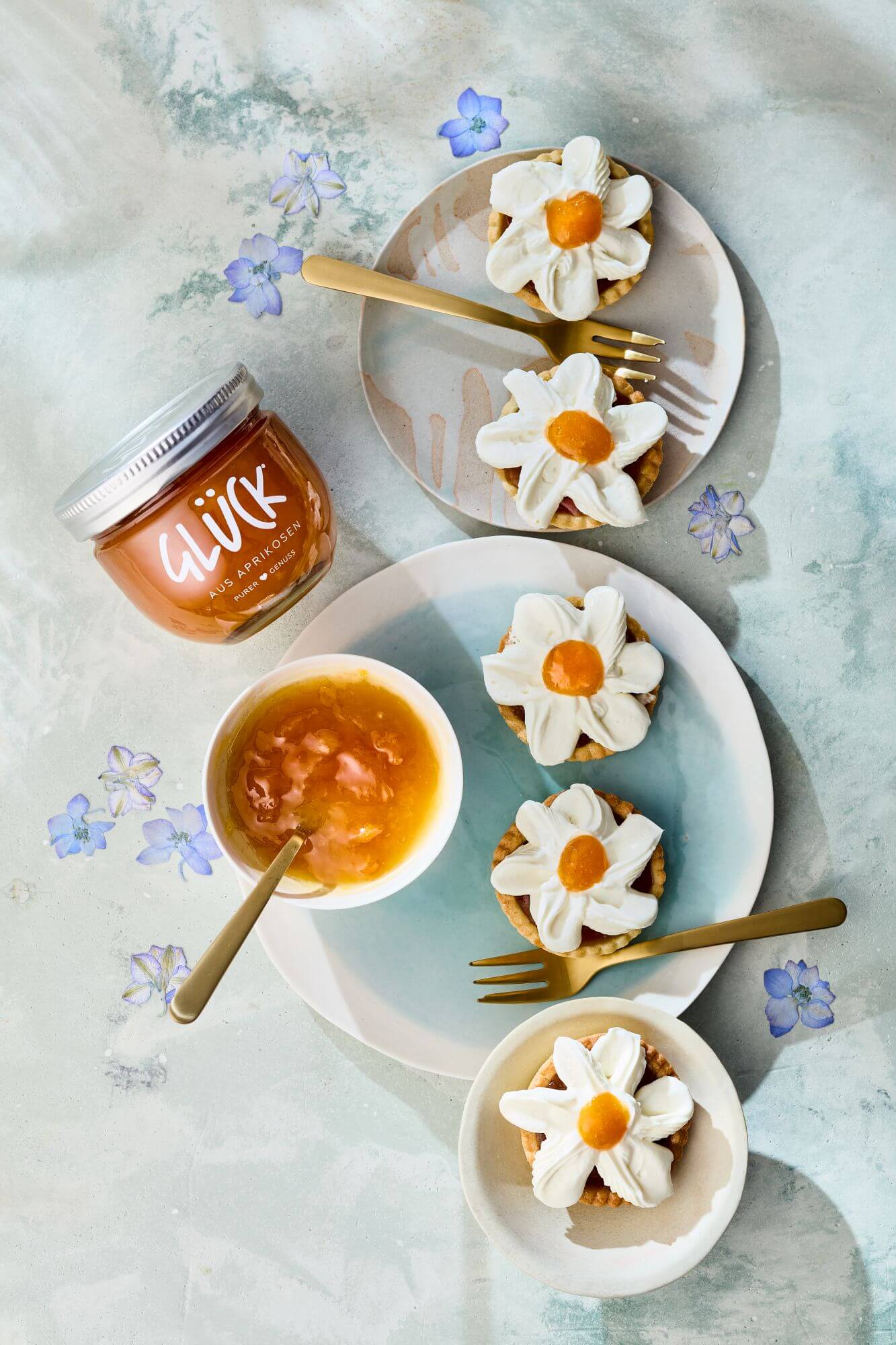- Für das Topping die Schlagsahne mit Vanillezucker steif schlagen und den Doppelrahmfrischkäse unterheben. Die Creme in einen Spritzbeutel mit Blatttülle füllen und auf die glatt geschnittene Oberfläche der Tartelettes gänseblümchenartig aufspritzen. In die Mitte jeder Blüte 1 TL GLÜCK aus Aprikosen geben. Bis zum Servieren kaltstellen.
