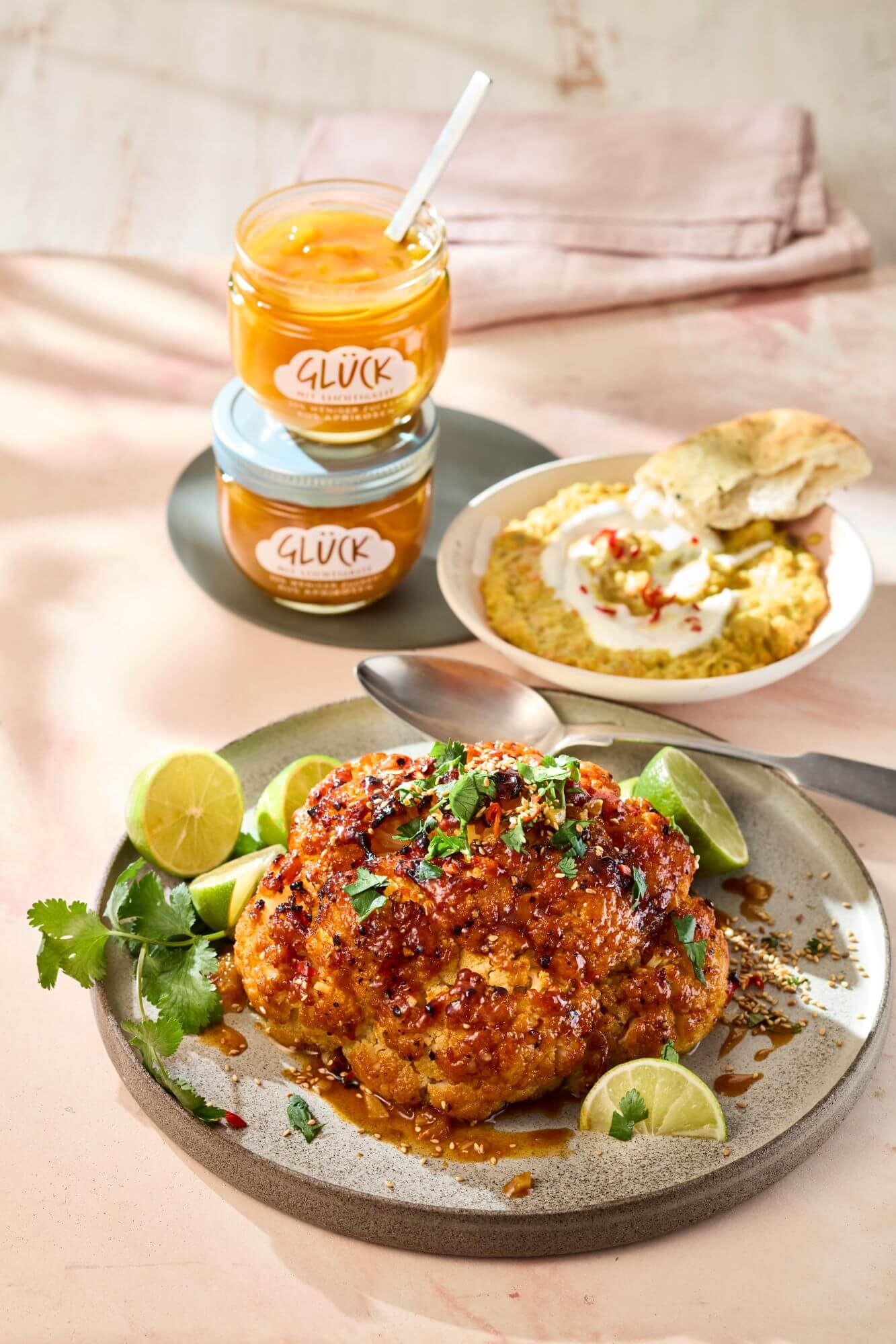 - 2 gehackte Knoblauchzehen und Chili in 2 EL Öl anrösten. 1 EL Tomatenmark und GLÜCK mit Leichtigkeit aus Aprikosen zugeben und verrühren. Mit Sojasoße abschmecken. Den Blumenkohl mit der Soße einstreichen und auf ein mit Backpapier belegtes Backblech legen. Im Backofen bei 200°C Ober-/Unterhitze ca. 20 Minuten backen. Dabei immer wieder mit etwas Soße einstreichen.