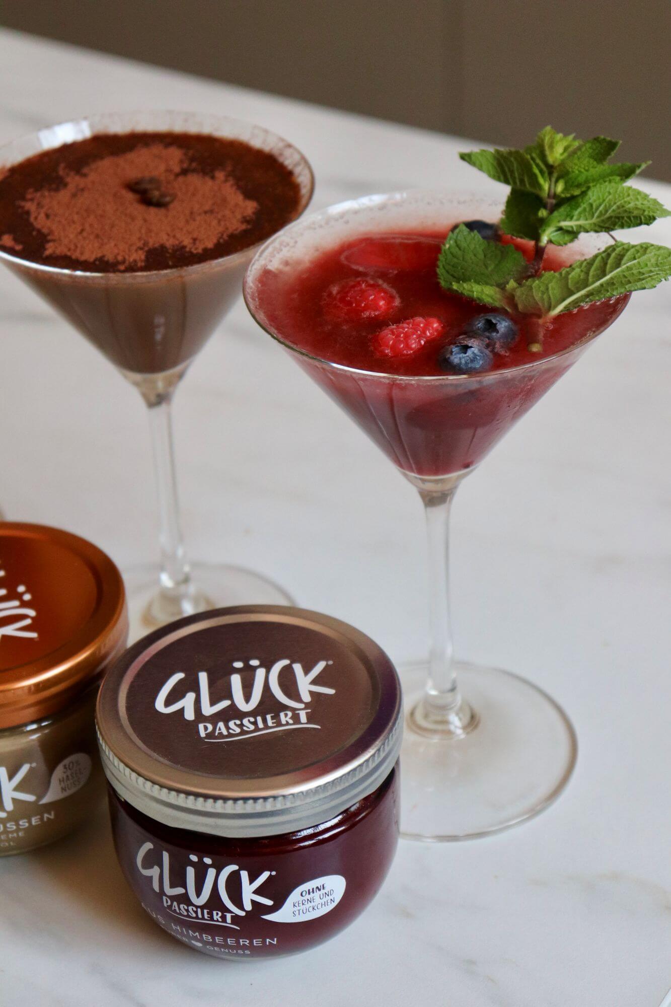 GLÜCK aus Haselnüssen zusammen mit 1–2 Eiswürfeln, Kaffeelikör, Wodka und Espresso in einen Shaker oder ein leeres GLÜCK Glas geben. Gut schütteln und in ein Cocktailglas eingießen. Mit Kakaopulver bestäuben und servieren. - GLÜCK Cocktail aus Himbeeren: