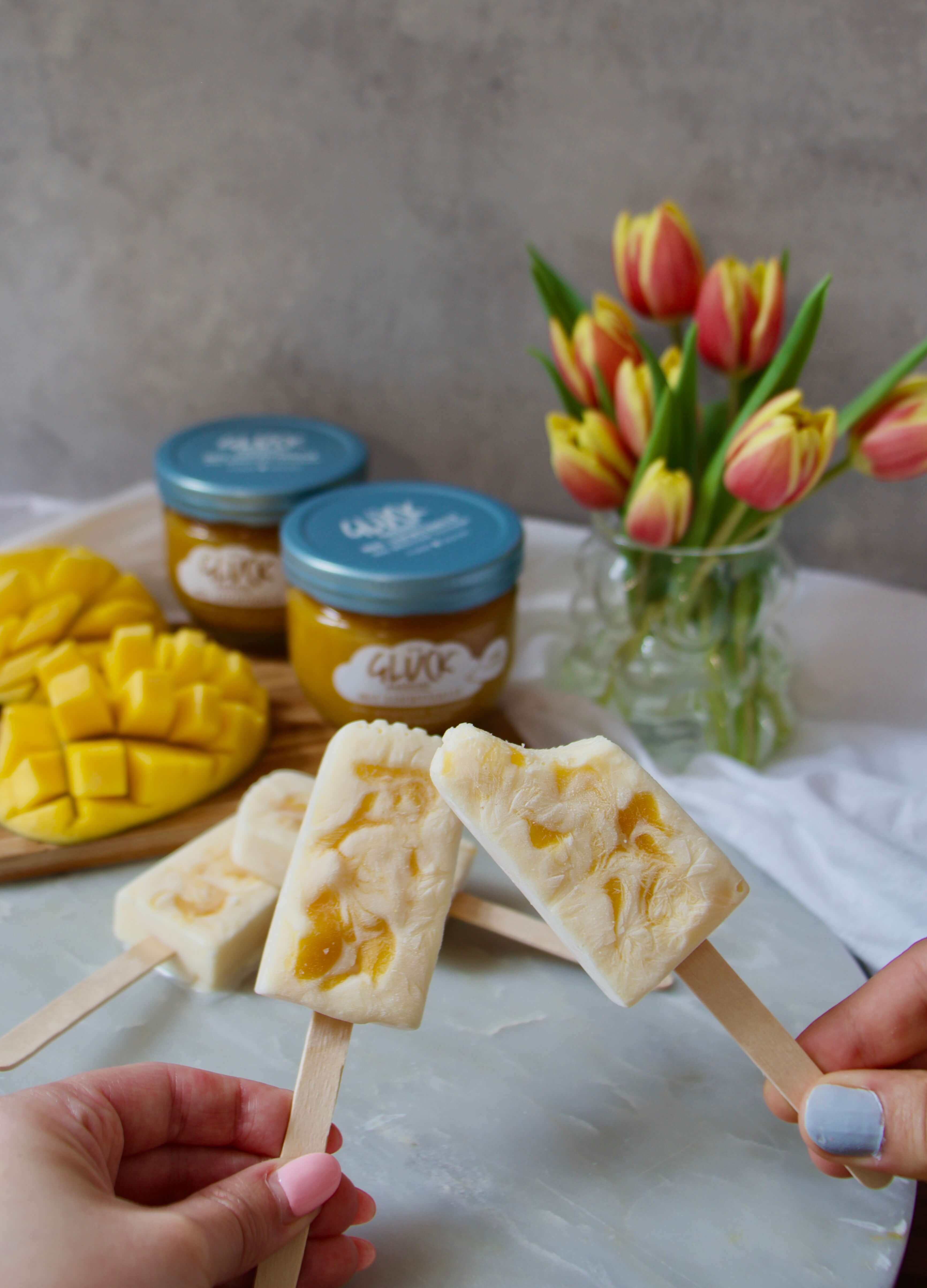 - Eisform mit Stielen versehen und Joghurtmischung einfüllen. 1 EL GLÜCK passiert mit Leichtigkeit aus Mango grob untermischen, sodass farbliche Swirls entstehen.