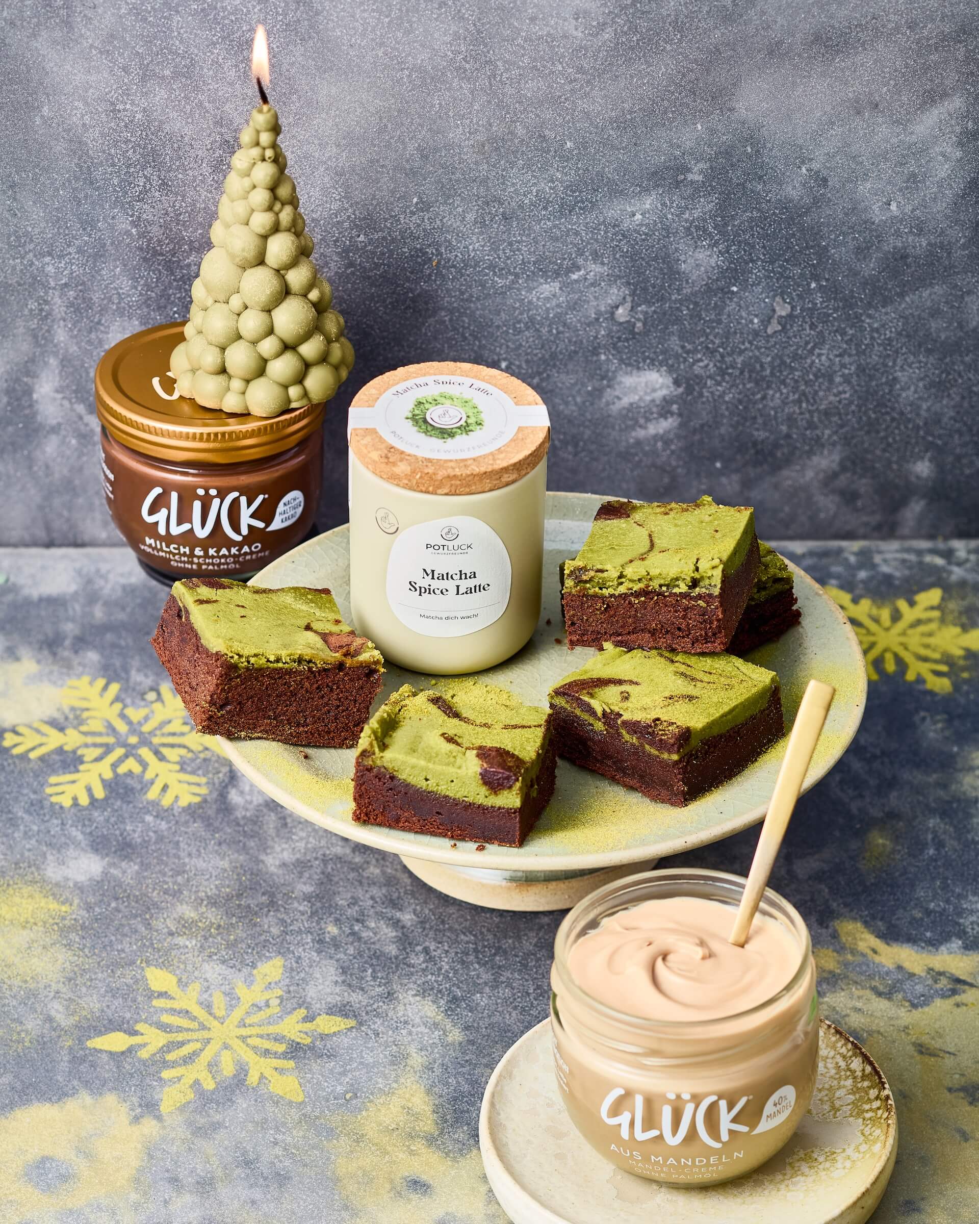 - GLÜCK aus Mandeln mit Frischkäse, Sahne und POTLUCK Matcha Spice glattrühren, bis eine kräftig grüne, streichfähige Masse entsteht. Brownieteig in eine mit Backpapier ausgelegte eckige Springform (ca. 18 × 28 cm) geben. Matcha-Mandel-Creme großzügig löffelweise auf der Oberfläche verteilen und mit Stäbchen marmorieren, sodass die grüne Schicht gut sichtbar ist.