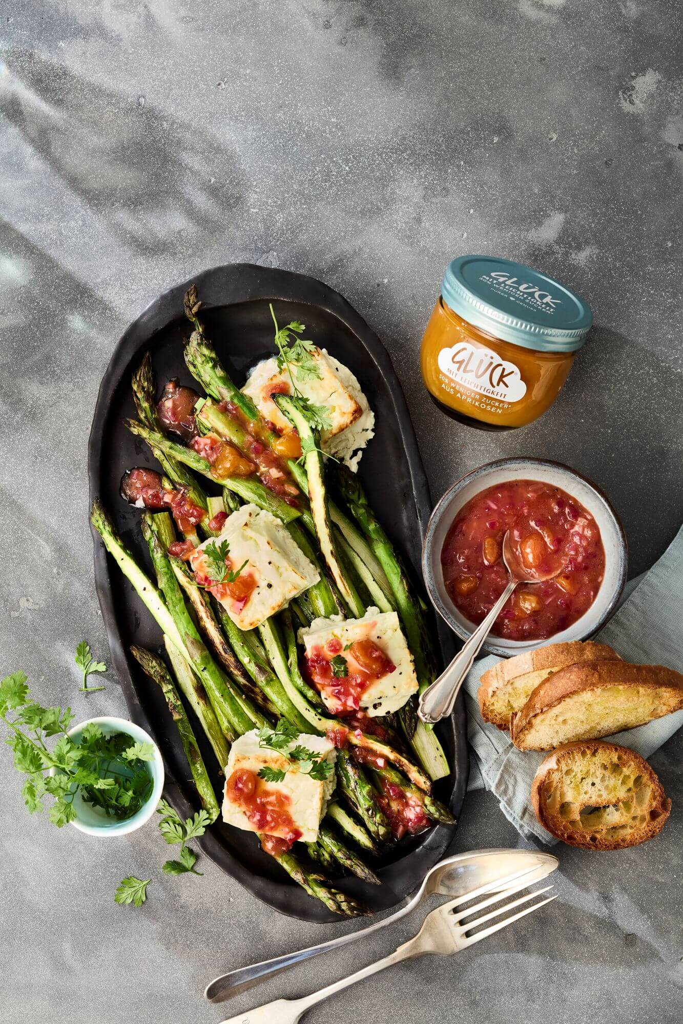 - Inzwischen Knoblauch und Zwiebeln schälen und fein würfeln. Beides in 2 EL Öl andünsten. Mit dem Essig ablöschen und mit den Chiliflocken, Orangensaft und GLÜCK mit Leichtigkeit aus Aprikosen verrühren. Mit Salz würzen. Kerbel waschen und grob zerzupfen. Das Ciabatta in Scheiben schneiden, mit 1-2 EL Öl bestreichen und ebenfalls kurz rösten.