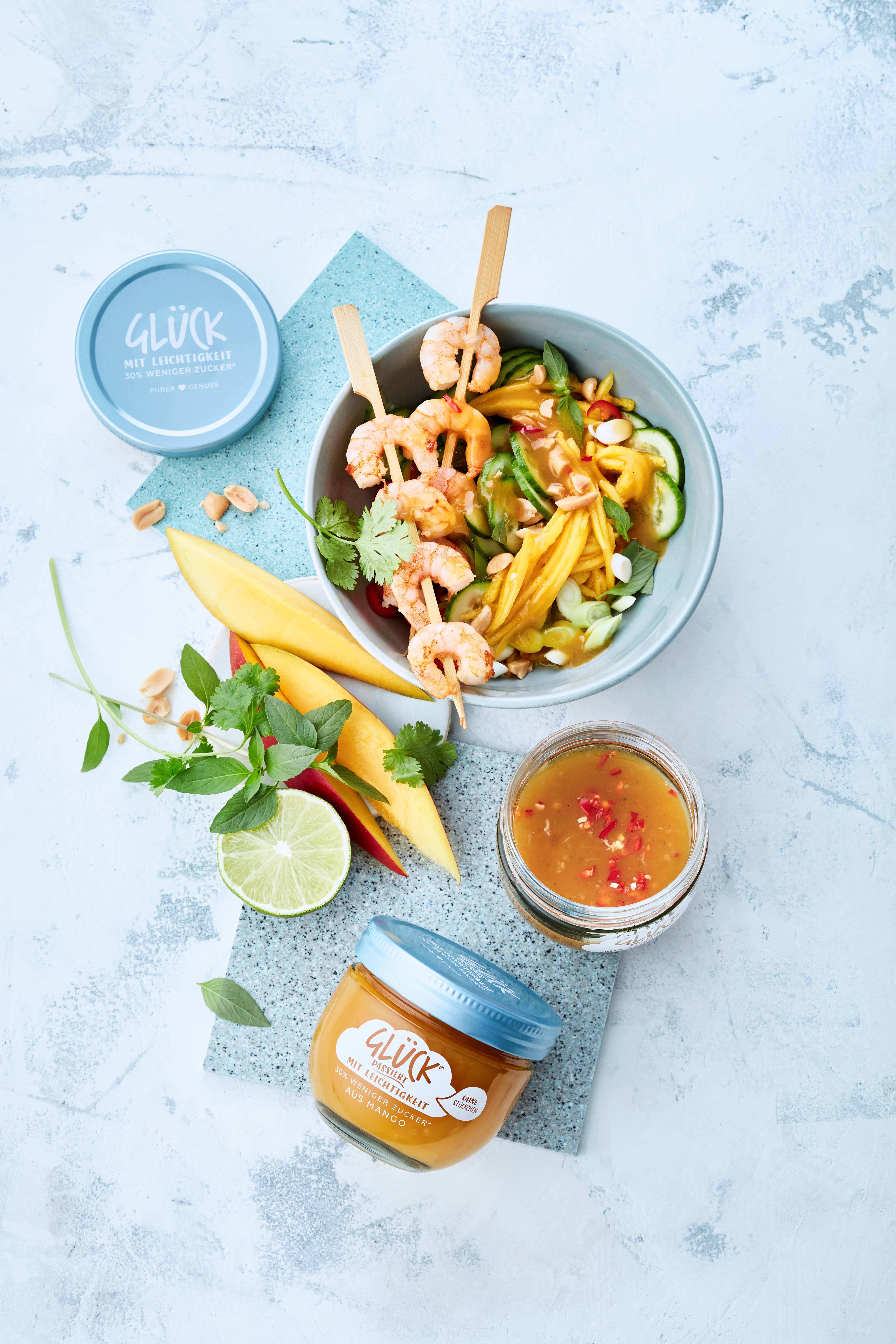 - Erdnüsse grob hacken. Gurken- und Mangostreifen mit Frühlingszwiebeln und Kräutern mischen. In Schalen verteilen, das Mango-Dressing darüber träufeln und mit Erdnüssen bestreuen. Die Garnelen dazu servieren.