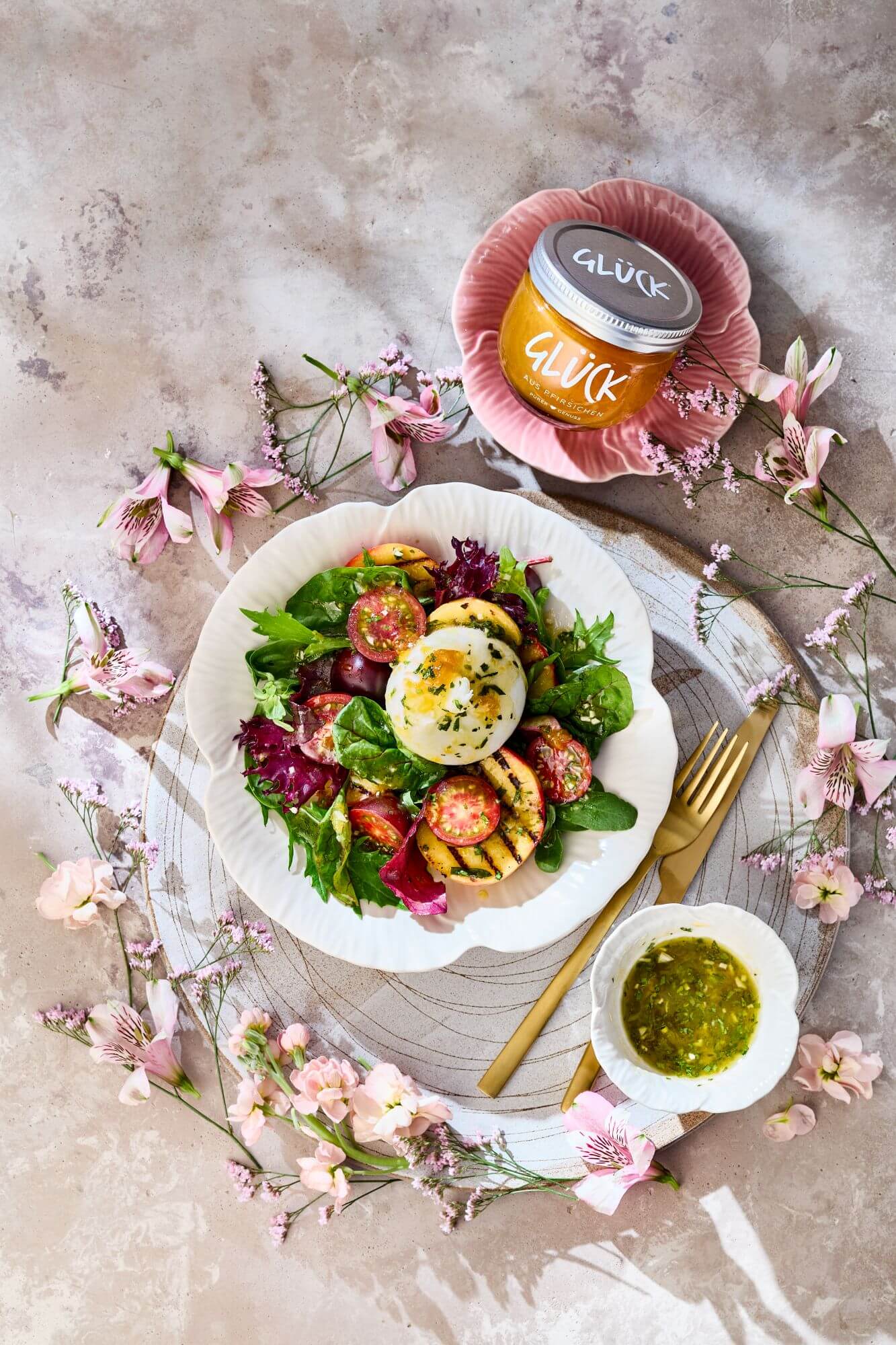 - Die Salate mit den Tomaten und den gegrillten Pfirsichscheiben auf Tellern anrichten. Jeweils einen Burrata daraufsetzen, mit dem Dressing beträufeln und sofort servieren.