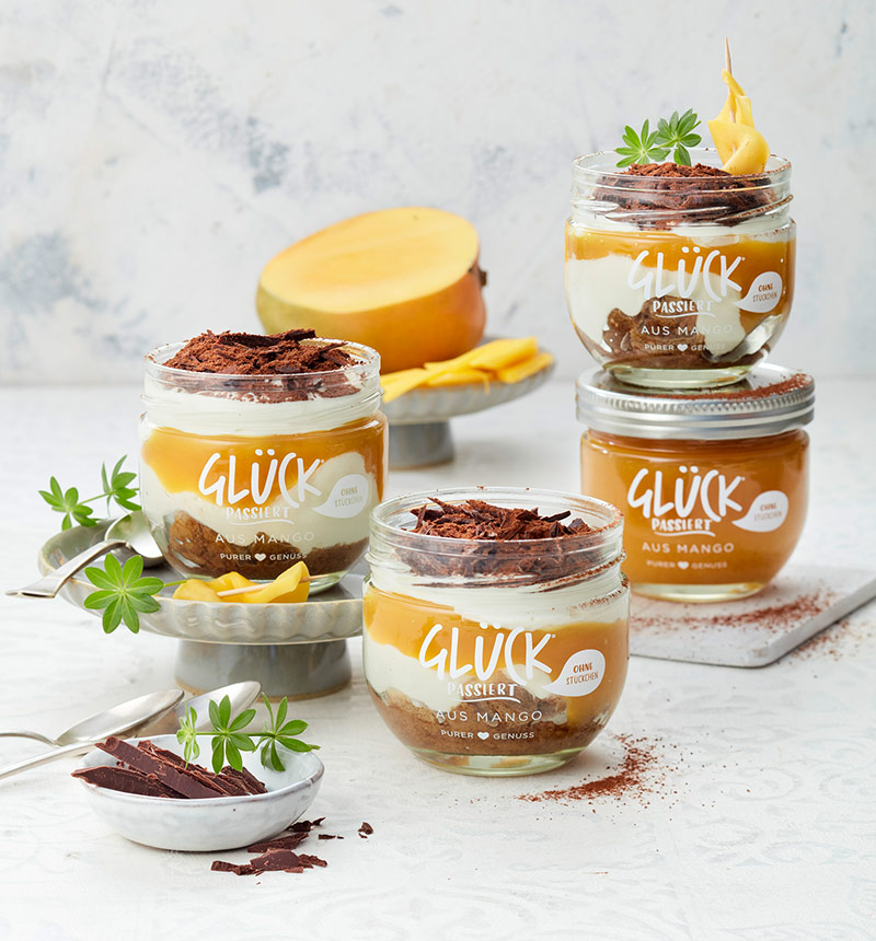 - Die Hälfte der Ricottamischung auf die Löffelbiskuits in den Gläsern verteilen. Darauf „GLÜCK passiert aus Mango“ verteilen und mit der restlichen Ricottamischung abschließen. Glatt streichen und für mindestens 2 Stunden im Kühlschrank kalt stellen, damit das Tiramisu fest wird und sich die Aromen verbinden können.